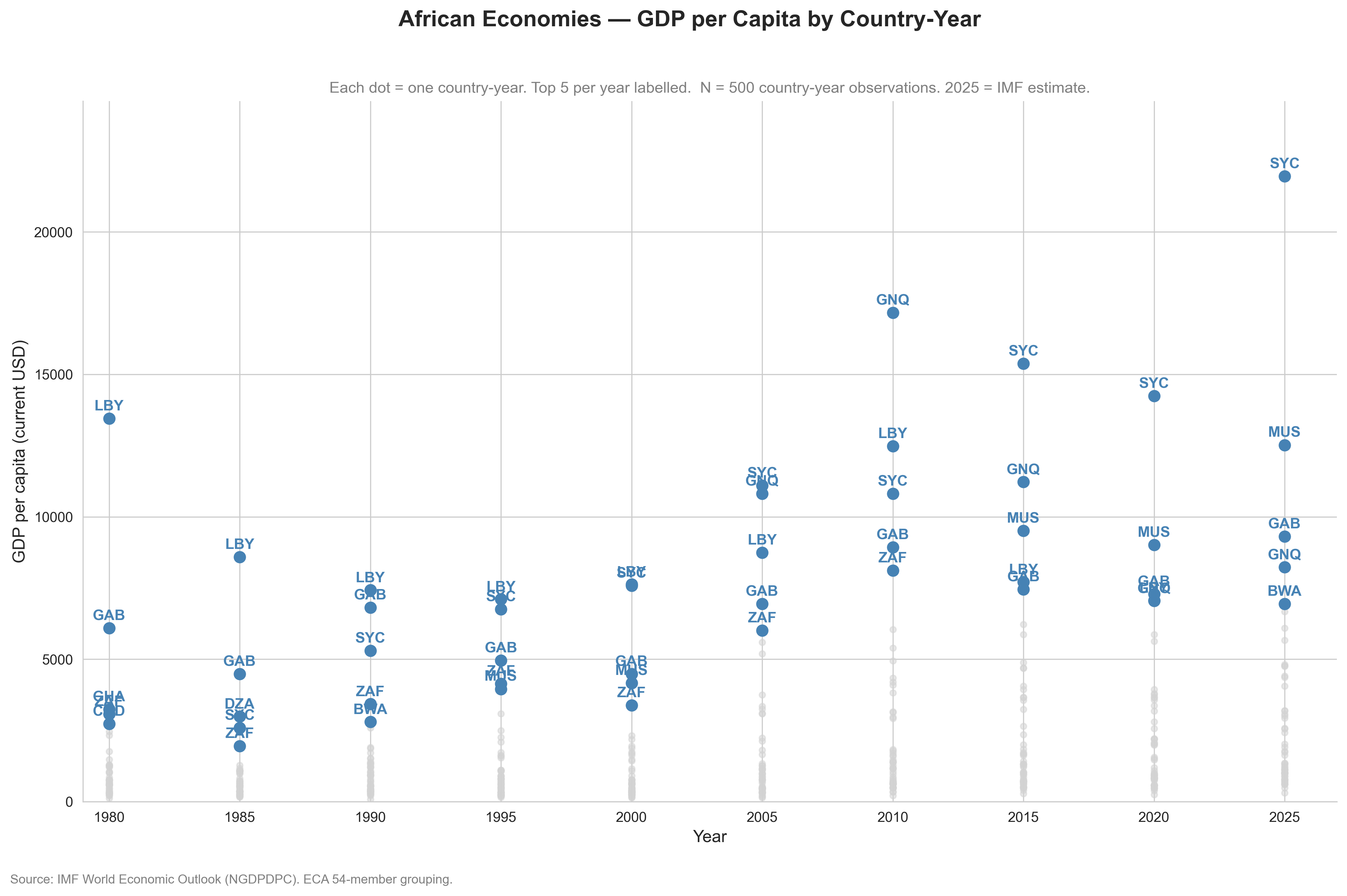 1# pip install sdmx1 pillow requests pycountry seaborn2import sdmx3import pandas as pd4import numpy as np5import matplotlib.pyplot as plt6import seaborn as sns7import pycountry8import requests9from PIL import Image10from io import BytesIO11from matplotlib.offsetbox import OffsetImage, AnnotationBbox12from datetime import datetime1314# ── 1. Country list ───────────────────────────────────────────────────────15ECA54_ISO3 = [16 "DZA","AGO","BEN","BWA","BFA","BDI","CPV","CMR","CAF","TCD","COM",17 "COG","COD","CIV","DJI","EGY","ERI","ETH","GNQ","GAB","GMB","GHA",18 "GIN","GNB","KEN","LSO","LBR","LBY","MDG","MWI","MLI","MRT","MUS",19 "MAR","MOZ","NAM","NER","NGA","RWA","STP","SEN","SYC","SLE","SOM",20 "ZAF","SSD","SDN","TZA","TGO","TUN","UGA","ZMB","ZWE","SWZ"21]2223# Landmark years only — keeps the plot uncluttered24target_years = {1980, 1985, 1990, 1995, 2000, 2005, 2010, 2015, 2020, 2025}2526# ── 2. Fetch IMF WEO ─────────────────────────────────────────────────────27# NGDPDPC = GDP per capita, current USD.28# Country-key query (ECA54.NGDPDPC.A) is faster than key="all".29IMF_DATA = sdmx.Client("IMF_DATA")30ECA54 = "+".join(ECA54_ISO3)3132resp = IMF_DATA.data(33 "WEO",34 key = f"{ECA54}.NGDPDPC.A",35 params= {"startPeriod": 1980, "endPeriod": 2025},36)3738ser = sdmx.to_pandas(resp)39df = ser.rename("value").reset_index() if isinstance(ser, pd.Series) else ser.copy()40df = df.rename(columns={"COUNTRY": "ISO3", "TIME_PERIOD": "year"})4142keep = [c for c in ["ISO3", "year", "value"] if c in df.columns]43df = df[keep]4445df["year"] = pd.to_datetime(df["year"].astype(str), errors="coerce").dt.year46df["value"] = pd.to_numeric(df["value"], errors="coerce")47df["year"] = pd.to_numeric(df["year"], errors="coerce").astype("Int64")48df = df[df["year"].isin(target_years)].copy()49df = df.dropna(subset=["value"])5051# ── 3. ISO2 + rank ────────────────────────────────────────────────────────52df["ISO2"] = df["ISO3"].apply(53 lambda x: pycountry.countries.get(alpha_3=x).alpha_254 if pycountry.countries.get(alpha_3=x) else None55)56# Namibia edge case: pycountry returns None for "NA" (looks like null)57df.loc[df["ISO3"] == "NAM", "ISO2"] = "NA"5859df["rank"] = df.groupby("year")["value"].rank(method="first", ascending=False)60top5 = df[df["rank"] <= 5].copy()61others = df[df["rank"] > 5].copy()6263mask = (df["rank"] <= 5) & (df["ISO2"].isna())64print(f"{mask.sum()} missing ISO2 in top-5" if mask.any() else "Safe to proceed")6566# ── 4. Flag helper ────────────────────────────────────────────────────────67# Cache PIL Image, not OffsetImage — OffsetImage artists cannot be reused68# across ax.add_artist() calls; doing so silently moves rather than copies.69# Flags: github.com/matahombres/CSS-Country-Flags-Rounded70flag_cache: dict = {}7172def get_flag_image(iso2: str, zoom: float = 0.045):73 if pd.isna(iso2):74 return None75 iso2 = str(iso2).upper()76 if iso2 not in flag_cache:77 try:78 url = (f"https://raw.githubusercontent.com/matahombres/"79 f"CSS-Country-Flags-Rounded/master/flags/{iso2}.png")80 r = requests.get(url, timeout=5)81 flag_cache[iso2] = (82 Image.open(BytesIO(r.content)).convert("RGBA")83 if r.status_code == 200 else None84 )85 except Exception:86 flag_cache[iso2] = None87 img = flag_cache[iso2]88 return OffsetImage(img, zoom=zoom) if img is not None else None8990# Pre-fetch all unique flags before plotting91for iso2 in top5["ISO2"].dropna().astype(str).str.upper().unique():92 get_flag_image(iso2)9394# ── 5. Plot ───────────────────────────────────────────────────────────────95sns.set_style("whitegrid")96fig, ax = plt.subplots(figsize=(16, 9))9798# Non-top-5: single vectorised call (fast)99ax.scatter(100 others["year"], others["value"],101 s=18, color="lightgrey", alpha=0.6, zorder=2102)103104# Top-5: flag markers, fallback to labelled dot105for row in top5.itertuples(index=False):106 x, y = row.year, row.value107 flag = get_flag_image(row.ISO2)108 if flag:109 ax.add_artist(AnnotationBbox(flag, (x, y), frameon=False))110 else:111 ax.scatter(x, y, s=60, color="steelblue", zorder=3)112 ax.text(x, y + 30, row.ISO3, fontsize=7, ha="center", color="steelblue")113114# ── 6. Labels & formatting ────────────────────────────────────────────────115ax.set_xlabel("Year", fontsize=12)116ax.set_ylabel("GDP per capita (current USD)", fontsize=12)117y_max = df["value"].max()118ax.set_ylim(0, y_max * 1.12)119ax.set_xlim(min(target_years) - 1, max(target_years) + 2)120ax.set_xticks(sorted(target_years))121fig.suptitle(122 "African Economies — GDP per Capita by Country-Year",123 fontsize=16, fontweight="bold"124)125ax.set_title(126 f"Each marker = one country-year. Top 5 per year shown as flag. "127 f"N = {len(df)} country-year observations. 2025 = IMF estimate.",128 fontsize=11, color="grey"129)130fig.text(131 0.08, 0.02,132 "Source: IMF World Economic Outlook (NGDPDPC). ECA 54-member grouping.",133 fontsize=9, color="grey", ha="left"134)135sns.despine()136137today = datetime.today().strftime("%d%b%Y")138plt.savefig(f"Africa_GDPpc_countryball_{today}.png", dpi=300, bbox_inches="tight")139plt.show()